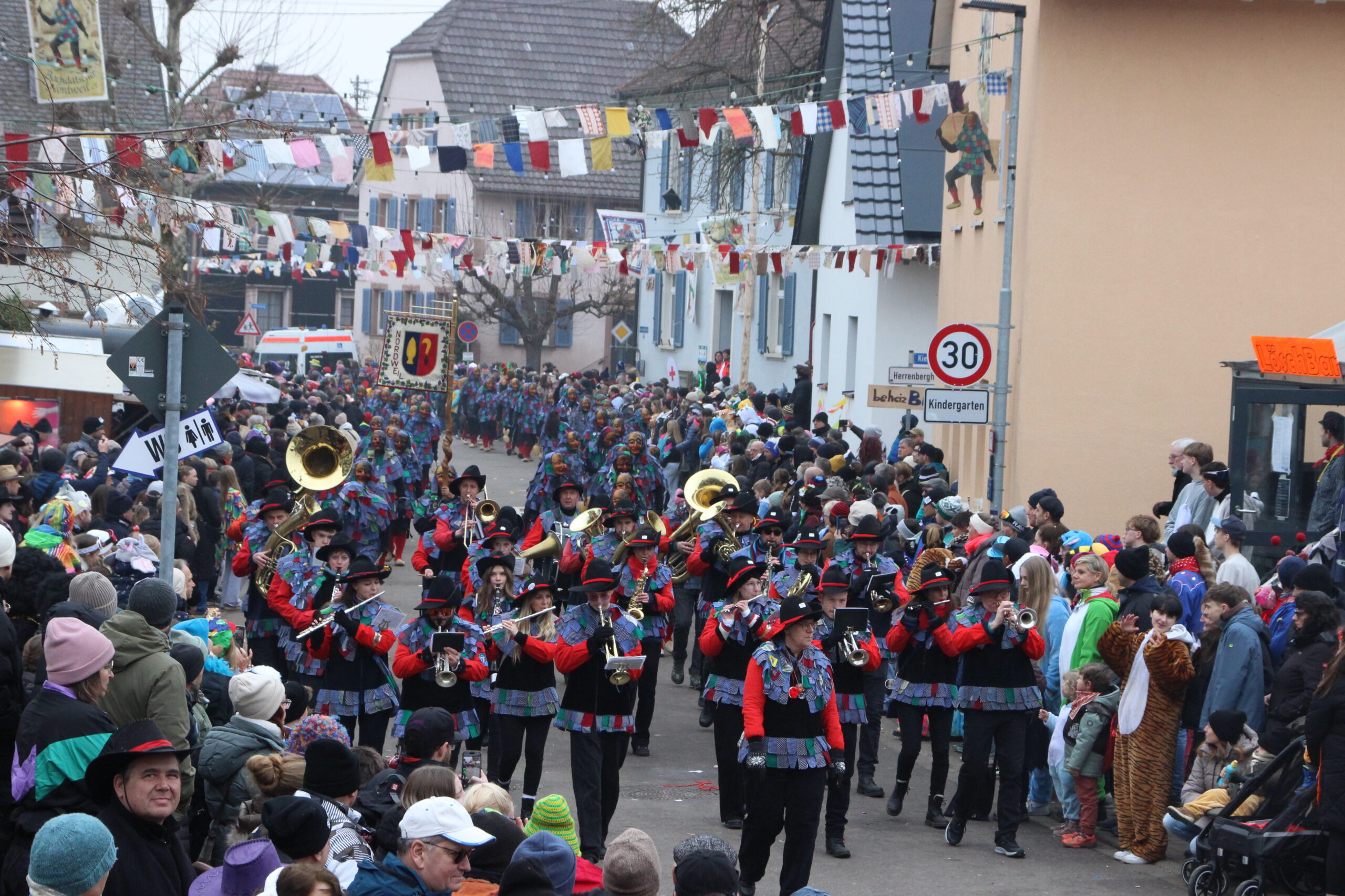 Jubelumzug Das nicht allzu kalte, aber diesig trockene Wetter bildete den passenden Kontrast zu dem bunten Treiben beim Jubiläumsumzug. So begrüßten die Honoratioren des „V.O.N.“ und Narrevadder Patrick Götz als erstes die zahlreich vertretene Bachdatscher-Jubiläumsnarren, die den Umzug inklusive Musikkapelle anführten. Gesäumt von hunderten Zaungästen, die sich entlang der Umzugsstrecke verteilten und sich an den zahlreichen Buden der Nordweiler Vereine mit Essen und Trinken versorgen konnten. Ein besonderes Spektakel boten die Bergteufel aus Oberprechtal, bei denen schon die Jüngsten bewiesen, dass sie laute Knalltöne mit der Karbatsche zu erzeugen wissen. Die Patenzunft der Spitzbue aus Oberwinden dagegen setzten ihre rot-blauen oder rot-grünen Schirme auch als Kontaktwerkzeug unter dem Publikum gekonnt ein. 35 Narrenzünfte nahmen mit über 3.000 Narren am Jubiläumsumzug teil. Dazu sind noch 27 Musikkapellen zu rechnen. Zu jeder vorbeiflanierenden Zunft wussten die V.O.N. Moderatoren und Narrevadder Patrick Götz auf der Tribüne beim Narrenbrunnen das Gründungsjahr und die Besonderheiten zu benennen.