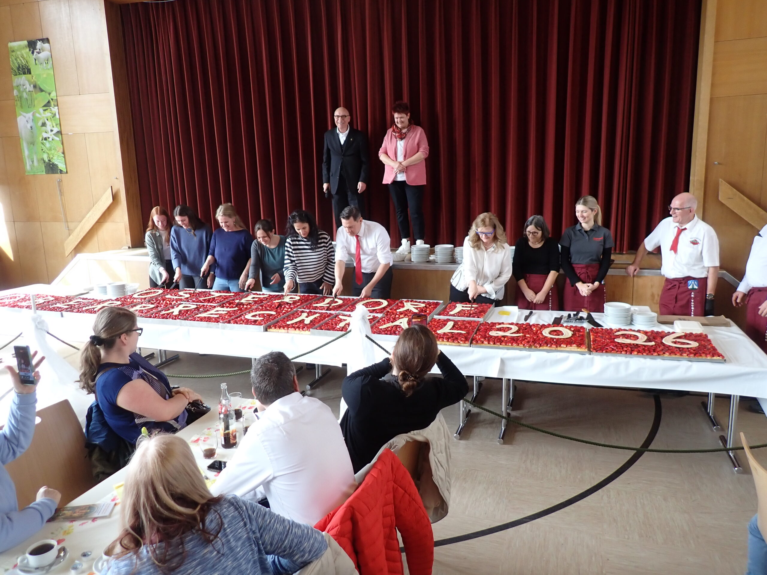 Ja und dann war da noch der ultimative Höhepunkt: Der gemeinsame Anschnitt der riesigen Ostertorte. Dafür waren tausende von Erdbeeren in stundenlanger Handarbeit verarbeitet worden. Die Ehre des Anschnitts bekam, unterstützt durch Johannes Fechner, das Lehrerkollegium der Karl-Siegfried-Bader Grundschule. Denn die wird nächstes Jahr nach Oberprechtal umziehen. „Wir hoffen, dass sie sich bei uns wohl und heimisch fühlen und wollen sie so gleich herzlich begrüßen“, so die Ortsvorsteherin. Das scheint gelungen: „Wir sind mit acht Lehrerinnen gekommen, und das in der Ferienzeit“, freute sich Schulleiterin Dagmar Zickgraf.