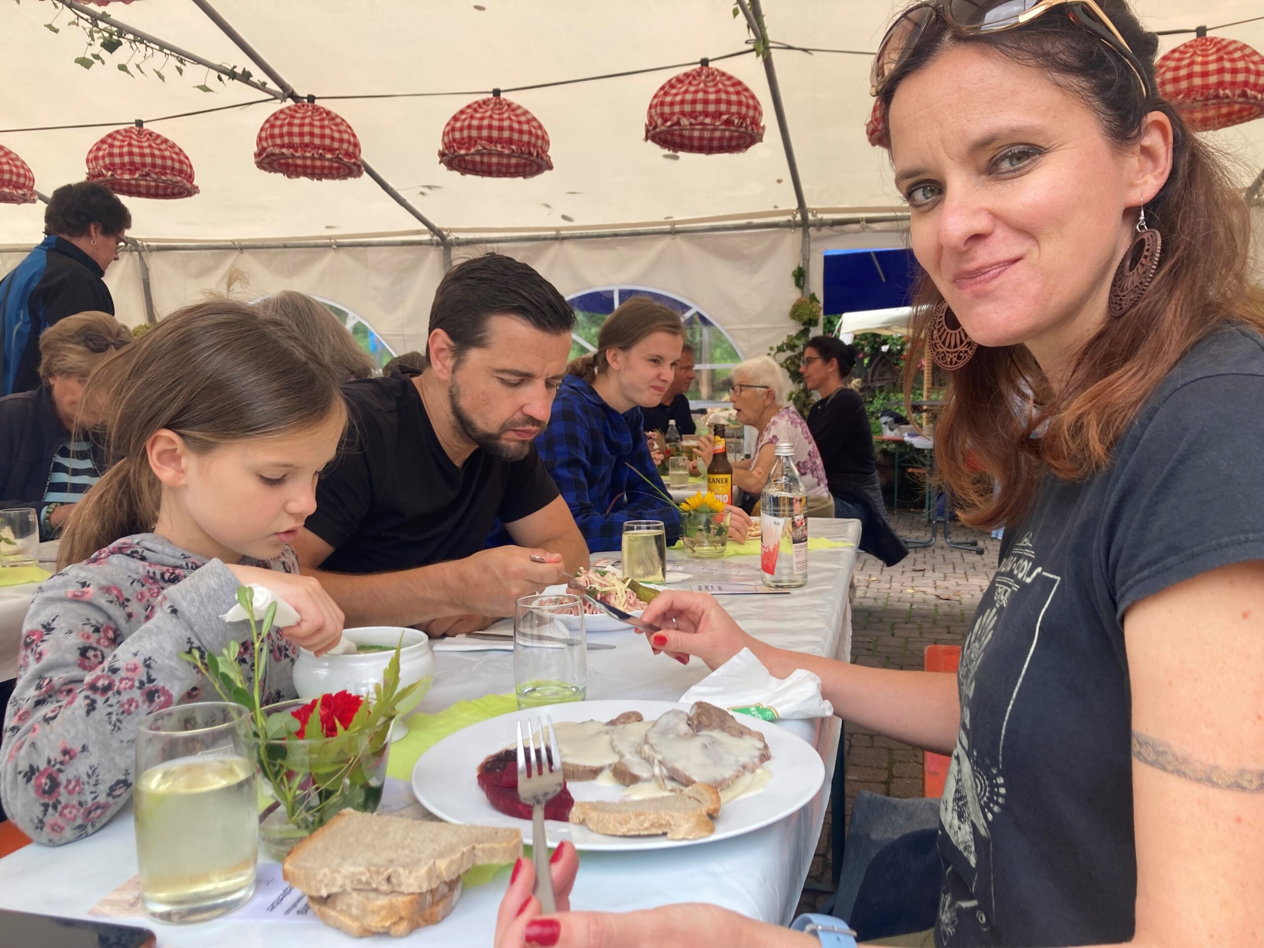 Gegen 13 Uhr gab es an den Tischen im Heimathaus, im Festzelt und im Hinterhof kaum noch freie Plätze. Wo sonst bekommt man althergebrachte badische Speisen zu einem solch günstigen Preis? Im Akkord brachten die Bedienungen die Teller mit Rindfleisch, Meerrettich, Preisbeeren und Rane an die Tische. Auch der frisch zubereitete Flammkuchen, der Wurstsalat, das Holzofenbrot und die legendäre Kombination aus „Bibiliskäs und Schlämbegüz“ kamen bestens an.