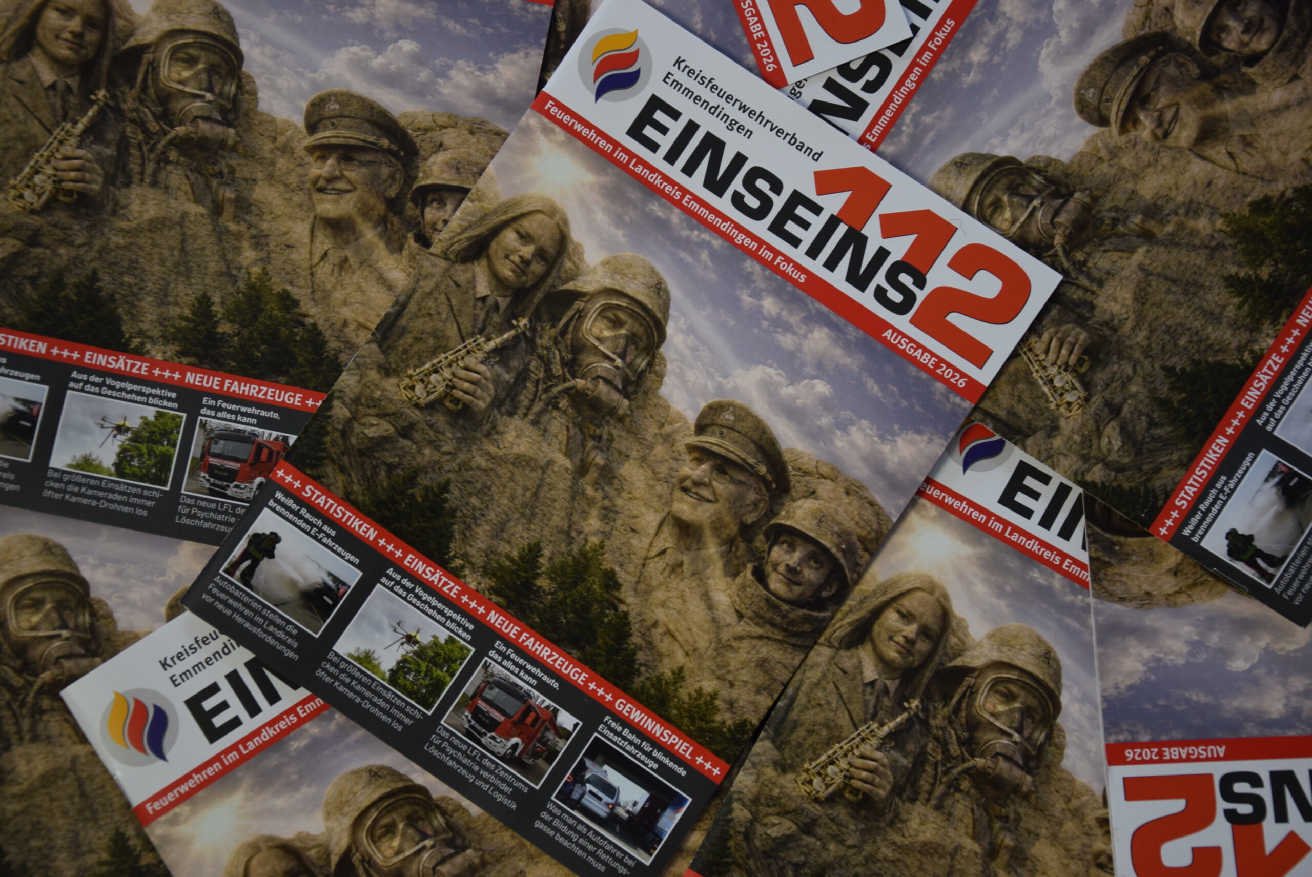 Besondere Mühe haben sich die Macher der „EinsEins2“ wieder mit dem Titelbild gegeben. Angelehnt ist das Cover an das amerikanische Felsmonument „Mount Rushmore“. Anstelle der vier US-Präsidenten George Washington, Thomas Jefferson, Theodore Roosevelt und Abraham Lincoln wurden mittels KI und Photoshop vier Feuerwehrleute in den Berg gemeißelt. Die Feuerwehrmusikerin, der Atemschutzgeräteträger, der Alterskamerad und der Jugendfeuerwehrmann stellen die Bandbreite der Feuerwehrarbeit im Landkreis dar.