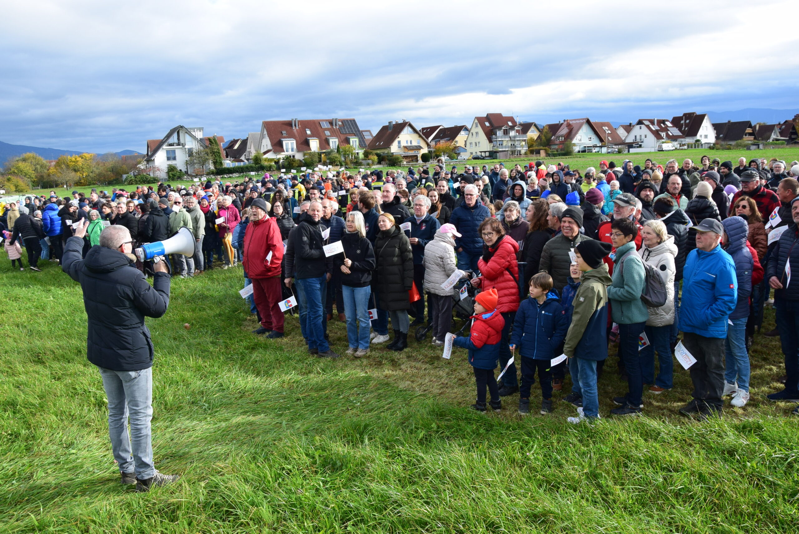 Trotz steifer Brise und einer bedrohlich dunklen Wolkendecke hatten sich fast 700 Einwohner (!) aus allen Generationen auf der großen Grünfläche hinter der Kirche “St. Felix und Regula” eingefunden. Sie alle waren der Einladung des Lenkungskreises “1250 Jahre Reute” und der Gemeindeverwaltung gefolgt. Spürbar angetan von der Resonanz war Bürgermeister Michael Schlegel. Um kurz nach 15 Uhr schnappte sich der Rathauschef ein Megafon, bestieg die Pritsche eines kleinen Lkws, begrüßte die Teilnehmer und erklärte diesen danach, was zu tun ist.