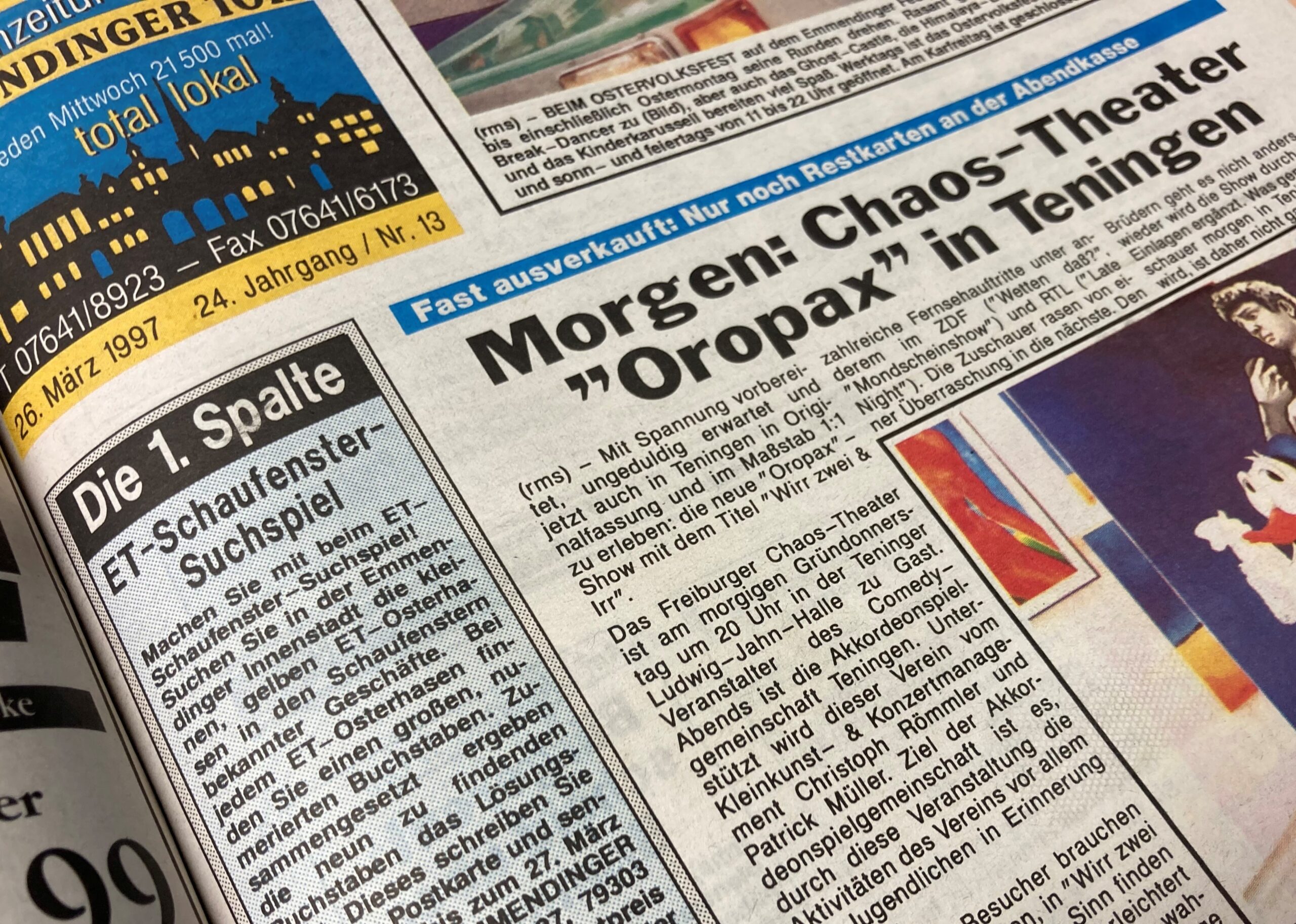 Gründonnerstag 1997 in der ausverkauften Ludwig-Jahn-Halle: 1.500 begeisterte Zuschauer erleben gerade den Auftritt des Chaos-Theaters „Oropax“. Abseits des Publikums stehen zwei junge Männer aus Teningen. Etwas nervös blicken sie sich um, ob auch alles funktioniert.