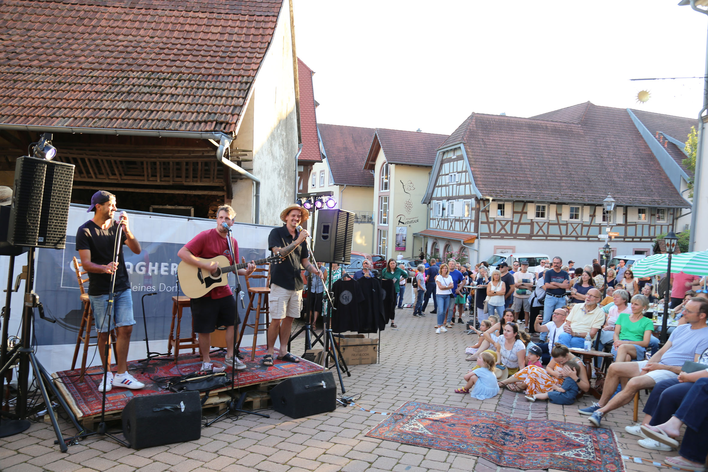 Die Premiere war der Band „Rhinwaldsounds“ mit den Musikern Dominik Büchele, Dominik Binning und Patrik Lehmann vorbehalten. Sie lockten mehr als 350 Besucher an – ein echter Erfolg. Die Gäste erlebten einen musikalischen Sommerabend voller Stimmung und guter handgemachter Akustik-Musik. Die sympathischen Musiker interagierten aktiv mit dem Publikum. Dieses hatte sich auf der Kirchentreppe und den Bierbänken rund um das Gasthaus Sonne platziert.