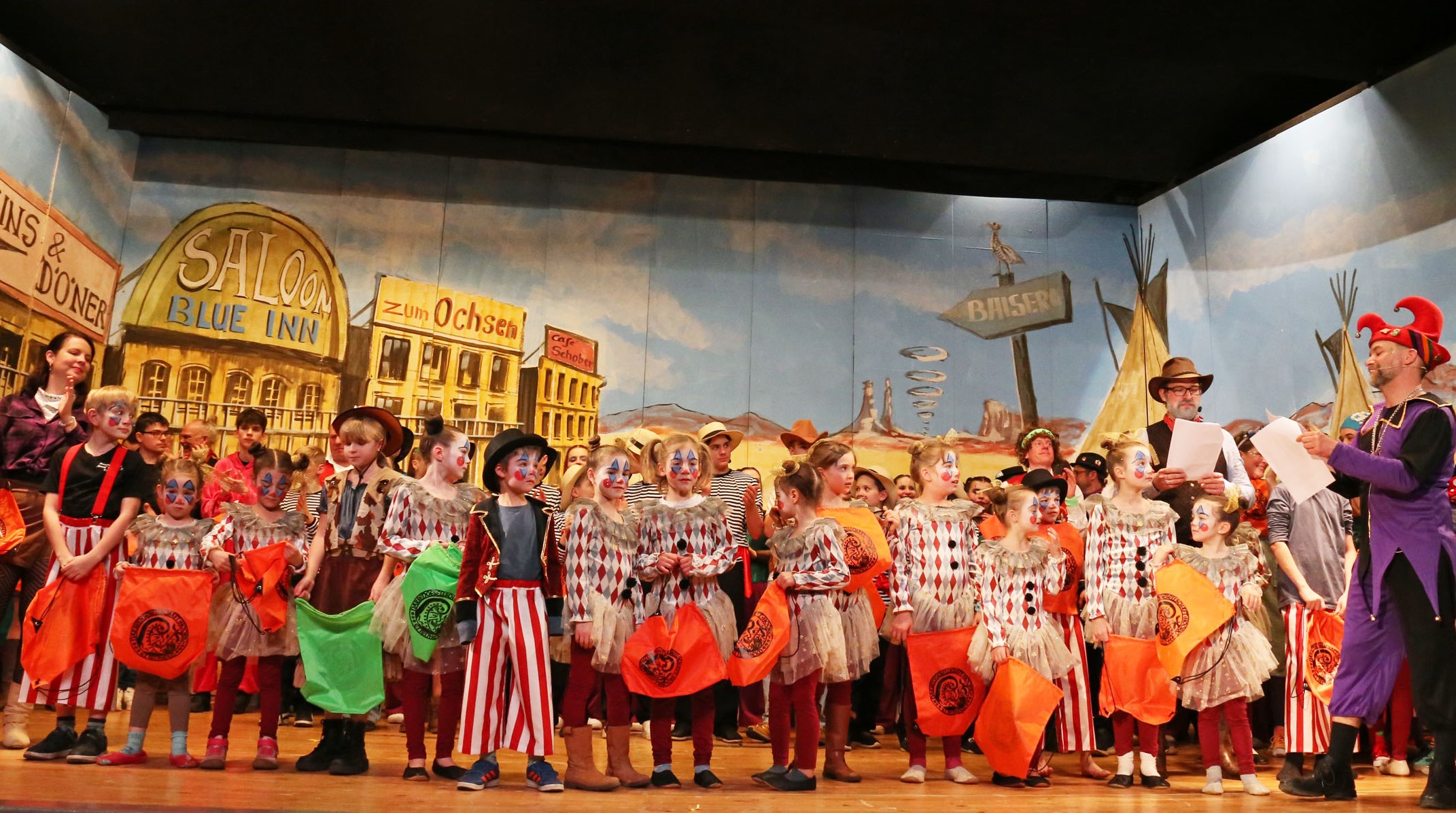 Die Moderatoren Konstantin und Daniel Frey führten stilgerecht in Westernstiefeln, mit defektem Colt und der Filmmusik von Ennio Morricones „Spiel mir das Lied vom Tod“ die Akteure zu ihrem Auftritt vor dem Hintergrund einer kleinen City irgendwo in der Wüste. Christian Wenzinger hatte das Gastronomiesterben in Äddene eindrucksvoll im Bühnenbild umgesetzt.