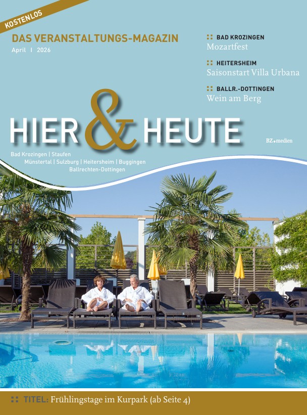 Bad Krozingen – Staufen – Münstertal – Sulzburg – Heitersheim – Buggingen – Ballrechten-Dottingen. In einer der schönsten Regionen des Markgräflerlandes mit hohem Wohn- und Freizeitwert und guter Anbindung an Freiburg präsentieren sich sieben aufstrebende Gemeinden Monat für Monat in ihrem gemeinsamen offiziellen Veranstaltungsmagazin HIER & HEUTE.