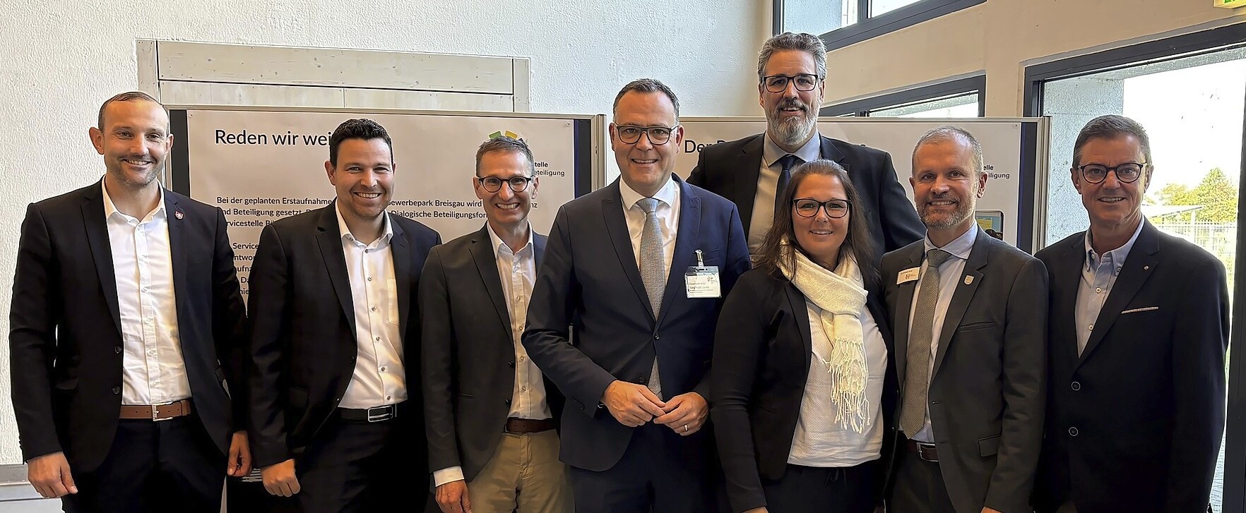 Von Anfang an hat die für das Projekt verantwortliche Behörde Wert auf die Beteiligung der Bürger gelegt. Dazu fand am Freitag vergangener Woche ein Infomarkt in der Alemannenhalle in Eschbach statt, an dem Landrat Dr. Christian Ante, der Staatssekretär der Justiz und für Migration, MdL Siegfried Lorek, Oberbürgermeister Volker Kieber aus Bad Krozingen, als Vorsitzender des Zweckverbands Gewerbepark Breisgau, und die Bürgermeister der Gemeinden Eschbach, Heitersheim, Hartheim und Neuenburg teilnahmen. Mittendrin natürlich auch Markus Riesterer, Verbandsdirektor des Zweckverbands Gewerbepark Breisgau und Geschäftsführer der Gewerbepark Breisgau GmbH. Die Herren informierten die Medien über den aktuellen Stand der Planungen und stellten sich den Fragen und Bedenken der Bürger.