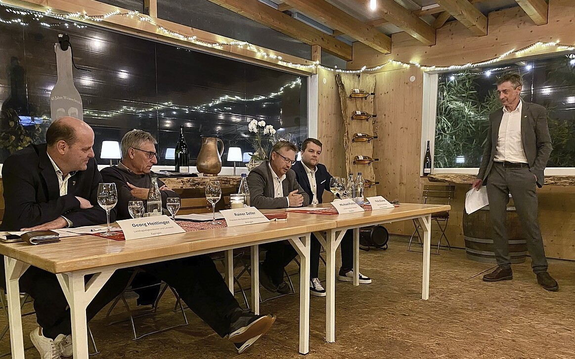 Zwar kamen nur elf Landwirte und Winzer zu der Veranstaltung, diese diskutierten jedoch engagiert und präsentierten den Referenten – dem Landtagsmitglied Georg Heidlinger, dem Präsidenten des Badischen Weinbauverbandes Rainer Zeller, dem BLHV-Kreisvorsitzenden Müllheim Michael Fröhlin und dem Gastronom und Landtagskandidaten der FDP Felix Düster aus Grenzach-Wyhlen – auch eigene Ideen.