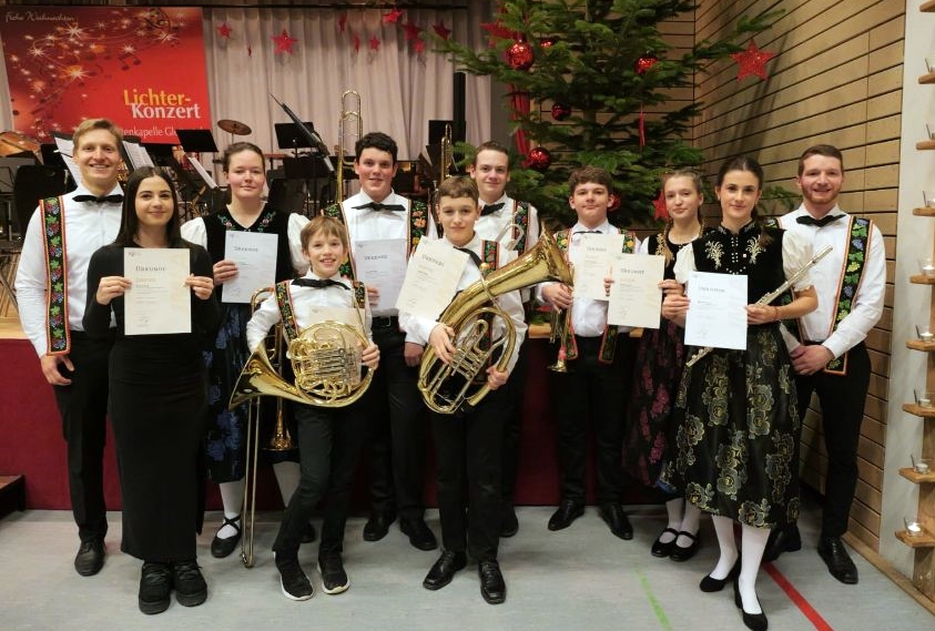 Leistungsabzeichen: Um in die Bläserjugend aufgenommen zu werden, dürfen sich die nachrückenden Zöglinge dem Musikerleistungsabzeichen in Bronze stellen, an das sich dieses Jahr Moritz Kostenbader, Hannah Laule, Joseph Maier, Sebastian Oberkirch, Sorina Popa und Johannes Wisser mit Bravour wagten. Wer Silber schafft, darf auch ins Große Orchester aufrücken, was Marlene Feser, Pia Lindinger und Noah Strecker für sich beanspruchen konnten. Am ersten Konzerttag, der immer am ersten Weihnachtstag stattfindet, konnten die Jungmusiker ihre Abzeichen durch die Vorstände Simon Lickert und Jonas Lindinger in Empfang nehmen.